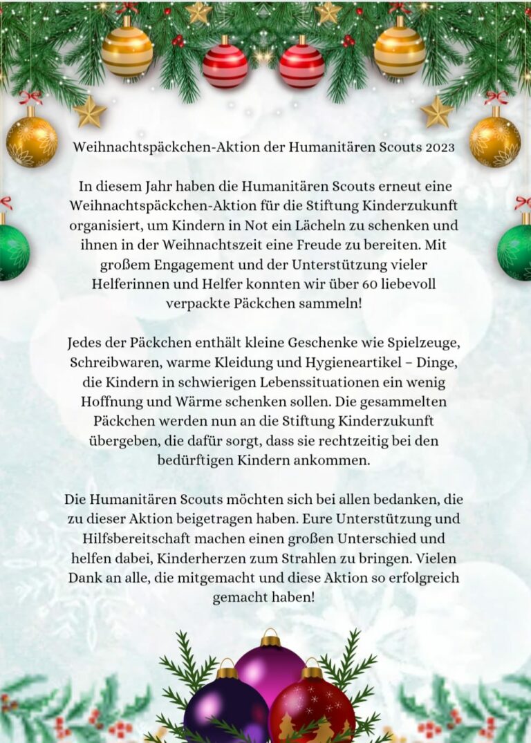 Wir freuen uns, unsere neuen Humanitären Scouts vorzustellen, die im Jahr 2023 ihre Ausbildung erfolgreich abgeschlossen haben. In einem intensiven dreitägigen Workshop wurden engagierte Teilnehmerinnen und Teilnehmer auf ihre Rolle als Scouts vorbereitet. Sie haben Kompetenzen entwickelt, die sie befähigen, gemeinsam mit anderen innovative und nachhaltige Projekte zu gestalten und humanitäre Ansätze in die Praxis umzusetzen.